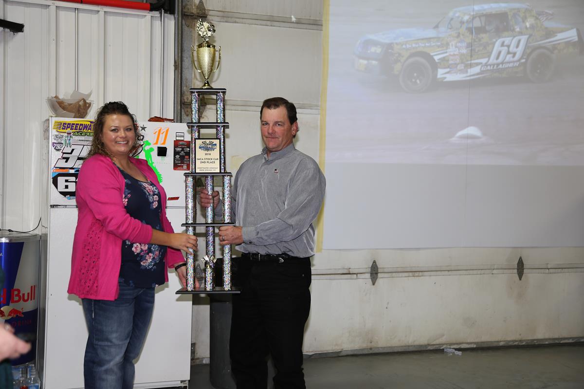 The 2018 Sweetwater Speedway Banquet was held on October 20, 2018. During the evening they showed videos of the great moments out at the race track. The speedway presented trophies to the Top 10 drivers in the IMCA Modified, Northern Sport Mod and Stock Car classes. All 6 Go-Kart drivers were presented trophies. They also recognized drivers in three categories that were voted on by the drivers: Hard Luck, Sportsman and Most Improved Driver.